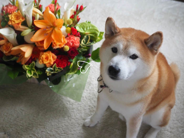 素晴らしいアレンジメントをいただいたので、「犬と花写真」を撮ろうと思ったけど、貫太は警戒して、さっさと移動してしまったので、お花が背景になるタイミングで写真を撮ったら、なんだか「ホストの紹介写真」のようになってしまった(笑)。あ、ホストクラブなんて行った
