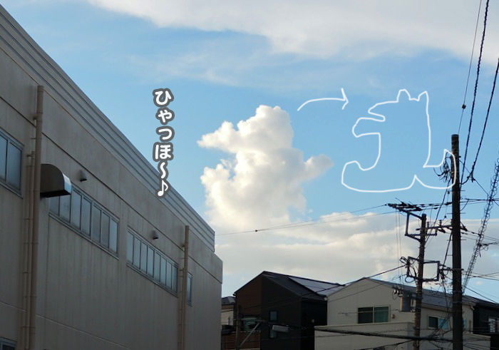 仲良し健斗君がお空に旅立った昨日の午後1時、私はジムに向かっていたので、写真は撮れなかったけど、爽やかな青空が広がっていました。そしてこれは、貫太の夕方の散歩の時に見た可愛い形の雲。私には、立ち上がって、空高く駆け上がって行く犬のように見えました。健斗君