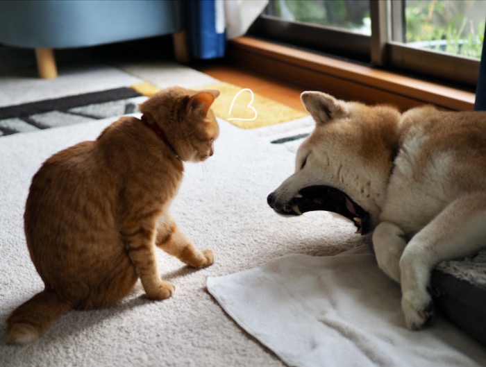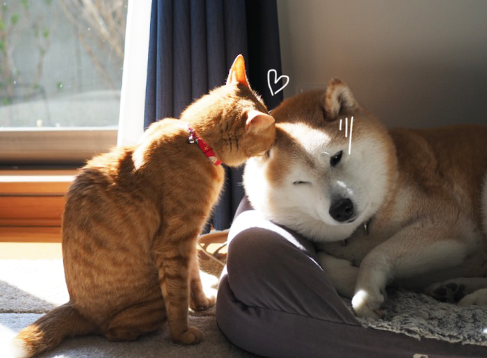 鮮やかな色のバーベナ。桜が終わっても、春は次々といろんな花が咲いて嬉しい♡さて、少し前の話ですが、かなり困り顔の貫太。その理由、わかりますか?原因は、やたら絡んできた猫です。貫太に構って欲しくて、まる子が、貫太の大きな顔にすりすりしたり、耳にずぼっと顔を