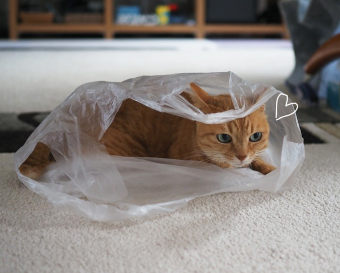 朝は晴れていたのに、午前9時ごろからどんより曇り空になってしまった湘南地方。日差しがなくて寒かった〜さて、少し前のことです。しまってあったとある物を取り出したら、包んでいたビニール袋でまる子が遊び始めました。そう。まる子はビニール袋遊びが好きなのでした。