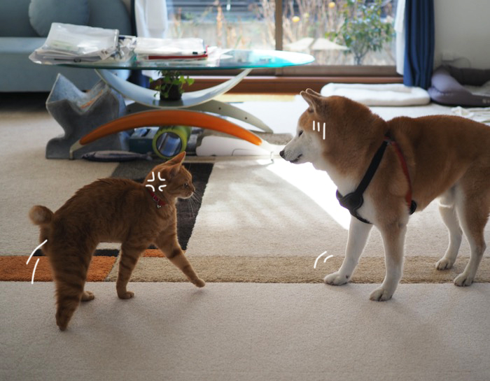 たまたま犬と猫の動線が重なった時、ピリリとした空気が流れ、大抵猫がささっと逃げると思うのだけれど、我が家の場合、こうなる(笑)。ま、こんな風になる前に、貫太がくるっと向きを変えて、立ち去る事が多いんだけどね。にほんブログ村貫太&あん&まる子は2つのランキ