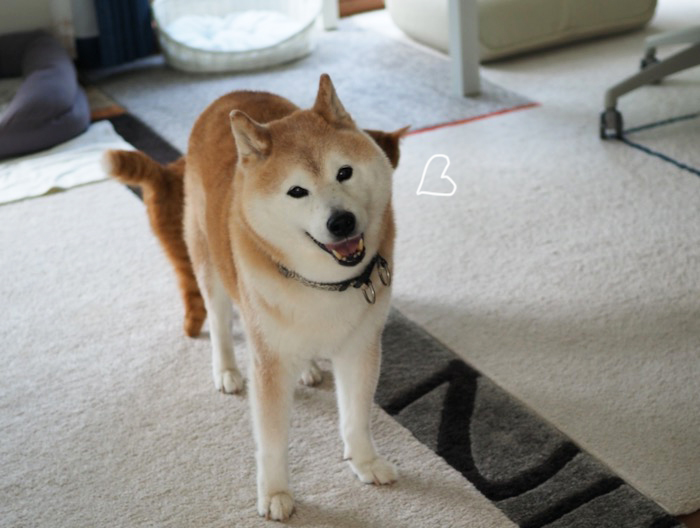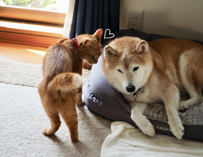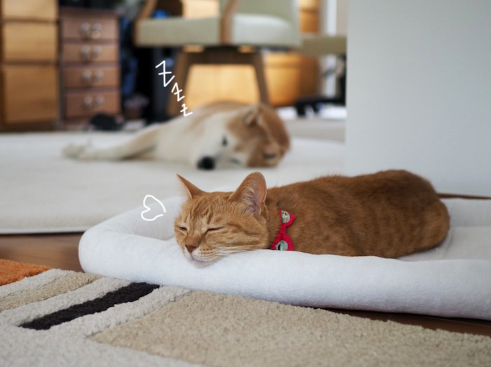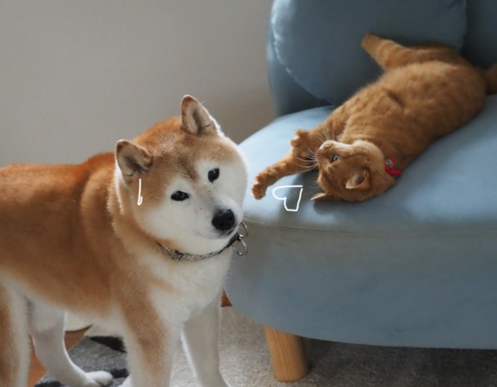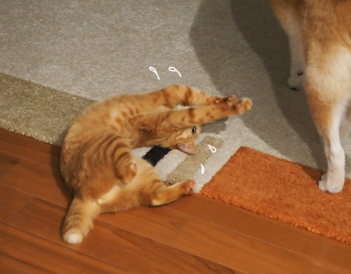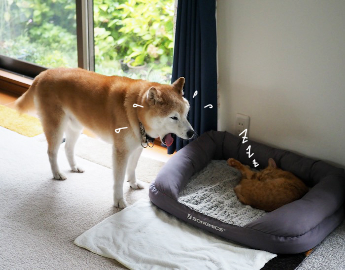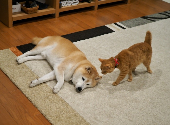 最近、まる子の貫太に対する“圧”が強まっている気がします。1日何回か、貫太兄さんに接近し、ぐいぐい体を押し付けます。貫太は、避けるのを諦め、無視して寝ようとしますが、しつこいまる子は、貫太の目の前でゴロンとなる。視線を避けて寝ようとする犬と、構って欲しい