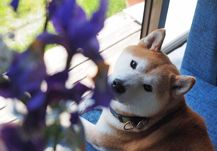 黄色いモッコウバラです小さい花が集まって、圧倒的な黄色このビタミンカラーに元気をもらっています。一方、こちらは、お義母さんの畑に咲いているアヤメ。鮮やかな紫先日、貫太を連れて写真を撮りに行きました。変な時間(昼間)にハーネスを付けられて、「???」な感じ