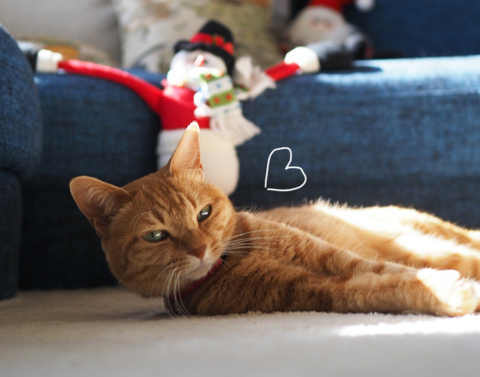 12月もはや中旬。強い風が吹くと、黄色く色づいたイチョウの葉っぱがハラハラと落ちてきます。さて、夜、私がお風呂に入っている間、脱いだパーカーとレッグウォーマーの上でのんびりするのが、最近のまる子のルーティン。でも、右後脚の先っぽが欠損しているので、首元が痒
