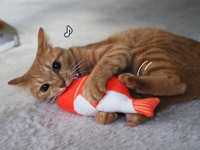 先日、お世話になっているKさんが我が家におみえになった時、まる子に頂戴した可愛いオモチャ。だったんだけど、好みが難しい猫なので(まる子だけかも…)、遊ぶ事はなかった。でも、ぷっくりした後ろ姿がとっても可愛いオモチャで、「少し貫太の後ろ姿に似てるかも…」なん