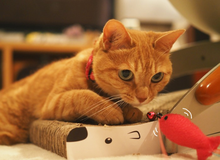 朝夕の風に、ほんの少し秋の気配を感じるようになってきました。夜は虫の声も聞こえます。さて、その夜ですが、毎日まる子とひと遊びしています。唯一まる子が反応する、小さめの魚の猫じゃらしで遊ぶんだけど、この魚への反応が、最近、イマイチ以前は魚を追いかけて、テー
