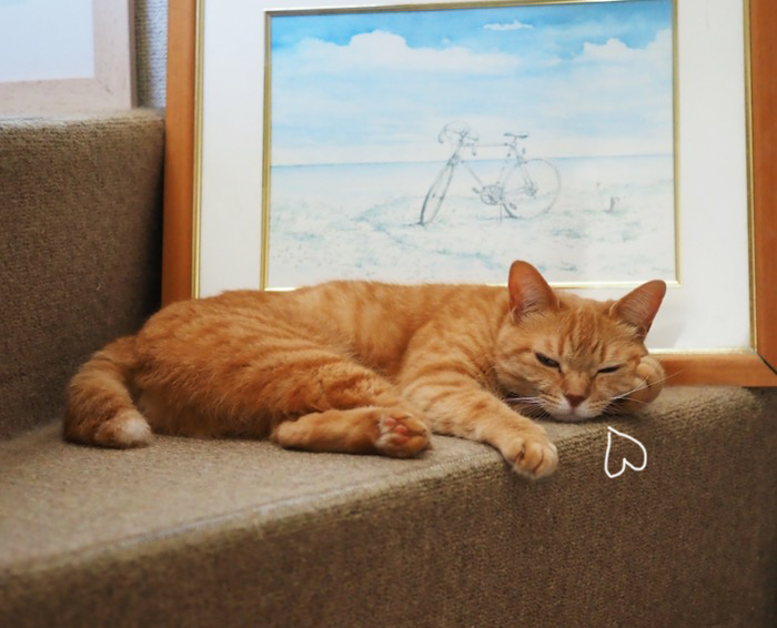 空が、青い…母屋の庭で、勝手に勢力を拡大させているノウゼンカズラです。鮮やかオレンジの花が可愛いんだけど…もはや脅威でしかない。脅威を感じるのは、連日のこの猛暑も。まる子は、日によって寝る階段の位置を変えています。2階の出窓からの風の吹き込み具合とか、1