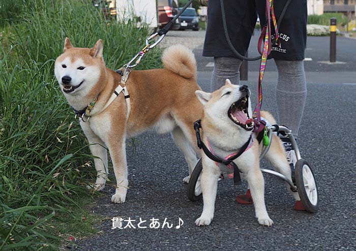 公園に咲いていたピンクのポピー♡可憐だわ 昨日は、可憐風あんの姿に、たくさんの褒めコメントをありがとうございました。そんなあんと貫太の笑える様子を、今日はご紹介します。先日、夕方の散歩で、早めに戻って来た貫太と遭遇したあん。すかさず兄さんの匂いを嗅ぎます