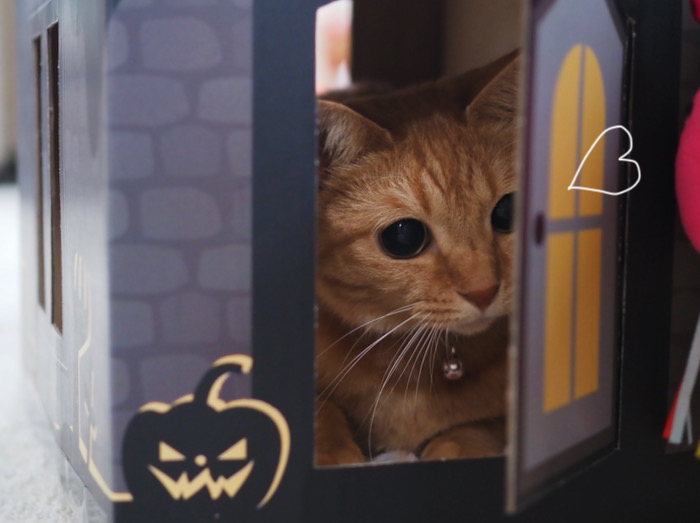 10月も後半に入っています。今月末はハロウィンですね。先月、100円ショップで、段ボール製のハロウィン用のペットハウスを見つけ、残り2個しかなかったので、買っちゃいました。「まる子、入るかなぁ?」と若干心配でしたが、好奇心旺盛なので、自ら侵入。猫じゃらしで釣っ