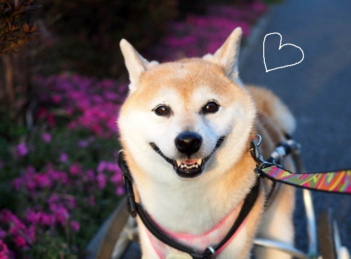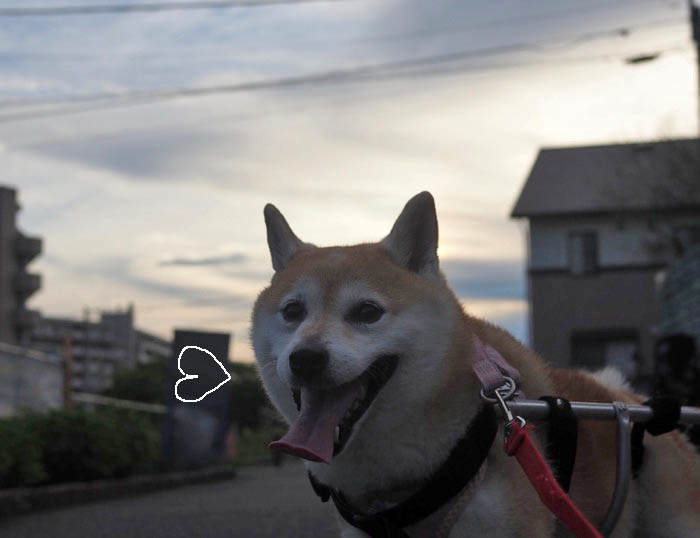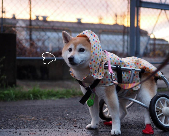 夕方の散歩に行くため、車椅子の装着を待っているあん。歩き始めると、空は夕焼け。5時過ぎにはかなり涼しくなるので、夕日をバックに気持ちよく歩けます。散歩道のあちこちで、コスモスが咲いている。空の色も、コスモスのシルエットも、余りに美しく、心にしみる♡でも、