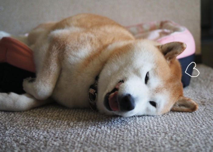 まる子はパネルヒーターの前でのんびり毛繕い。「あれっ!貫太くん、ベッドから追い出されて寒そう…」と思うのは誤解です。エアコンも付いているので、ピンクベッドは暑かったみたい。自らフローリングに移動して、クールダウンしていたようです。毛むくじゃらですからね♡