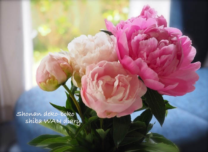 1週間前に、JAの市場で買って来た芍薬です。買った時は蕾でしたが、水切りして花瓶に挿したら、翌日から開花♡ゴージャスな花と、爽やかな甘い香り…「立てば芍薬…」と例えられる通り、本当に美しい花です。“あんと芍薬写真”を撮りたかったけど、花びらを噛まれるのが嫌