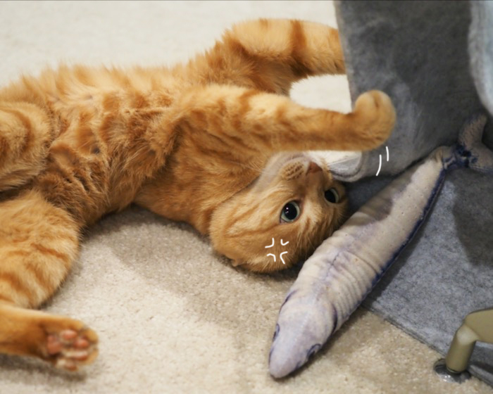 午前中晴れてきたので、洗濯物を外に干したら…降られた。を、2回繰り返したトホホな1日でした。さて、お気に入りのサンマをケリケリしていたまる子の、頭の上を貫太が通過して行ったので、貫太兄さんの足を、捕まえようと手を伸ばしたまる子でしたが、あとちょっとのところ