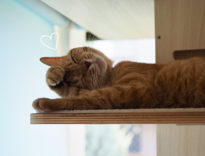 先日、いつもの年より早く咲き始めた母屋のエンゼルトランペット、次の蕾が膨らんできました。梅雨明けした木曜日、朝からピーカン だったので、早めにエアコンオン。冷房が余り好きではないまる子も、キャットタワーの上の方で、のんびり毛繕い。カーテン越しに、じんわ