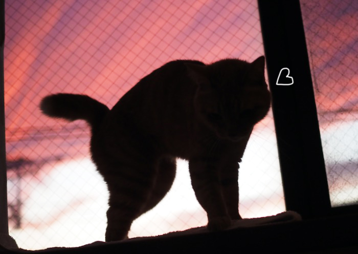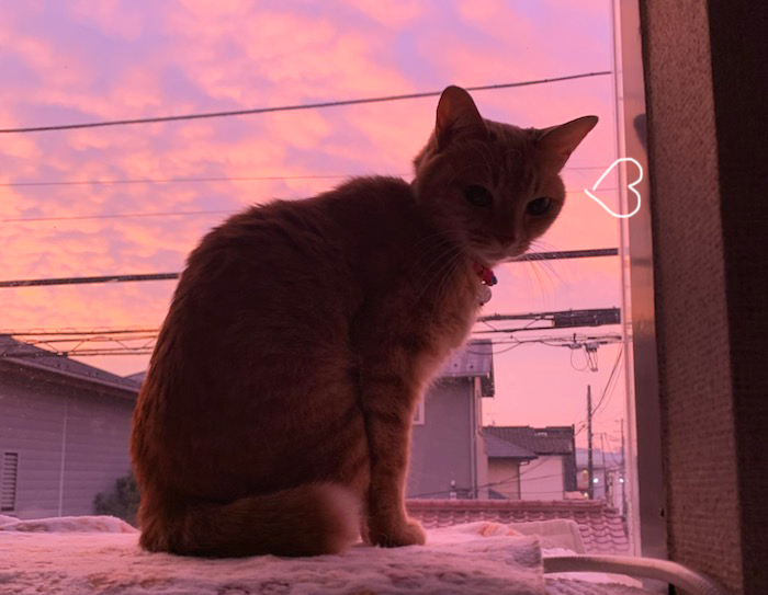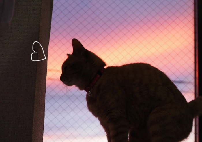 昨日の夕焼けは、怖いくらいの美しさ。まる子も、2階西側の出窓から空を眺めていました。夕焼けを見るためと言うより、出窓に上がって、西日を浴びながら昼寝をしていたら、いつの間にかこんな空になっていたって事みたいです。昼間は青色の空。夕方はピンク色の空。地球は