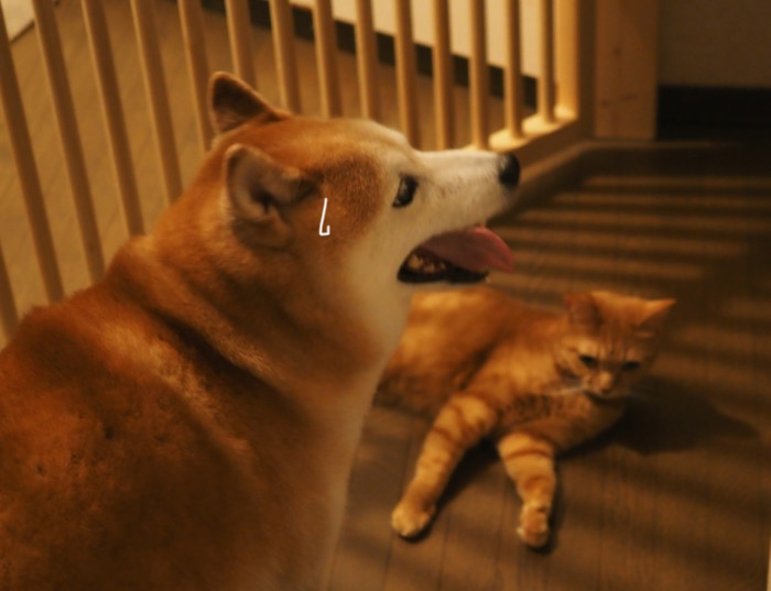 オレンジ色のコスモスの中に、1本だけ白い株がありました。白があると、他の色も映えます。さて、玄関に設置されているのは、檻ではなく、まる子用の脱走防止ゲート。その前にまる子が寝ていて、貫太がその先(階段の下)に行きたそうにしていました。こういう時、案外まる