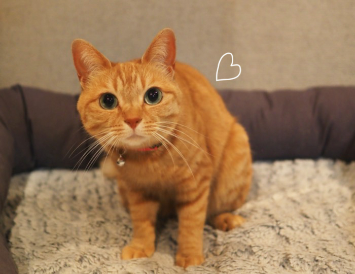 昨日の雨は、貫太の夕方の散歩に出る少し前にあがりました。散歩から帰ると、空にはピンクの雲が…そして夜11時、お風呂から出ると、まる子が珍しい所にいました。(いつもは洗面所のドアの前で私が出るのを待っている。←可愛いでしょ♡)グレーベッドでちょこんと香箱座り