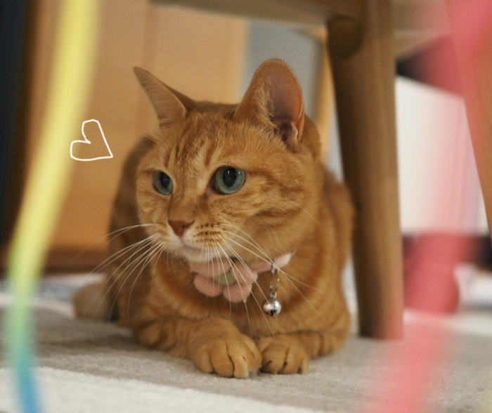 淡いピンクのストックが咲いていました。可愛らしい色ですねぇさて、紐状の猫じゃらしを振って、まる子を遊びに誘いました。「にゃ〜!にゃ〜!!(暇、暇〜!)」って鳴いていたから。ボールには興味を示しませんが、紐は割と好きなので、椅子の下にいるまる子の前で一生懸